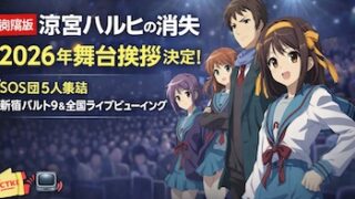 2026年2月、『涼宮ハルヒの消失』リバイバル上映を記念した舞台挨拶が新宿バルト9で開催決定。平野綾・杉田智和らSOS団5名が登壇と全国映画館でライブビューイングも実施。A special stage greeting event for The Disappearance of Haruhi Suzumiya will be held in February 2026 at Shinjuku Wald 9. All five main SOS Brigade cast members will appear, with a nationwide live viewing.