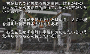本作はテキスト主体のノベルゲームで田舎の集落を舞台にしたストーリーが展開されます。ジャンルとしてはサウンドノベルに近く、操作よりも文章と演出でプレイヤーを引き込むタイプです。派手なシステムやグラフィックで押す作品ではなく、物語体験そのものに重きを置いています。
