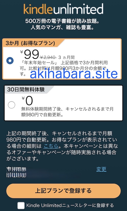 この状態でログインしたままKindle Unlimitedのキャンペーンページにアクセスしたところ3か月99円プランが表示されワンクリックで登録が完了。